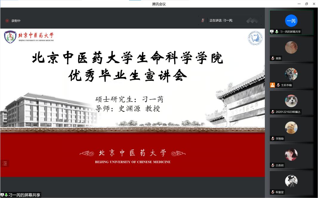 优秀硕士毕业生代表刁一芮结合自己参与的创新创业活动进行了分享,鼓励师弟师妹能够积极参加各类科研创新活动,锻炼能力、增长见识;一芮同学还和大家分享了自己在读期间在学习和生活各方面的长、短期规划的方法,以减少拖延、明确目标。
